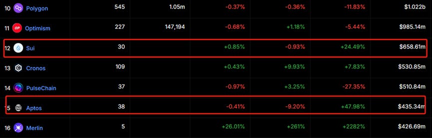 Sui在Aptos发布主网后,紧接着也上线了主网,并且一经上线就受到了主流市场的关注,市值达到19.35亿美元,完全稀释后的市值为149.39亿美元,市值排名56位。值得注意的是,虽然市值远低于Aptos,但Sui的TVL却高于Aptos,目前达到6.58亿美元。